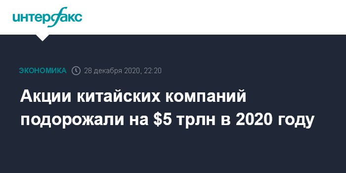 Москва. 28 декабря. INTERFAX.RU - Рыночная стоимость компаний Китая, акции которых торгуются на открытом рынке, за 2020 год выросла почти на $4,9 трлн благодаря быстрому восстановлению страны после пандемии коронавирусной инфекции, высокой активности в сфере первичных размещений и стремительному ралли потребительских и технологических компаний.