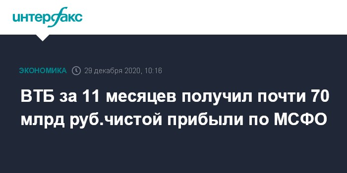 Москва. 29 декабря. INTERFAX.RU - ВТБ в ноябре получил 5,4 млрд рублей чистой прибыли по МСФО, как и месяцем ранее, свидетельствует сообщение банка.