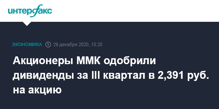 Москва. 29 декабря. INTERFAX.RU - Акционеры ПАО "Магнитогорский металлургический комбинат" на внеочередном собрании одобрили промежуточные дивиденды за III квартал в размере 2,391 рубля на акцию, говорится в сообщении компании.