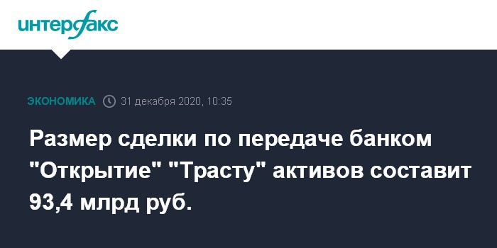 Размер сделки по передаче "Открытием" "Трасту" активов составляет 93,357 млрд рублей, говорится в сообщении "Траста".