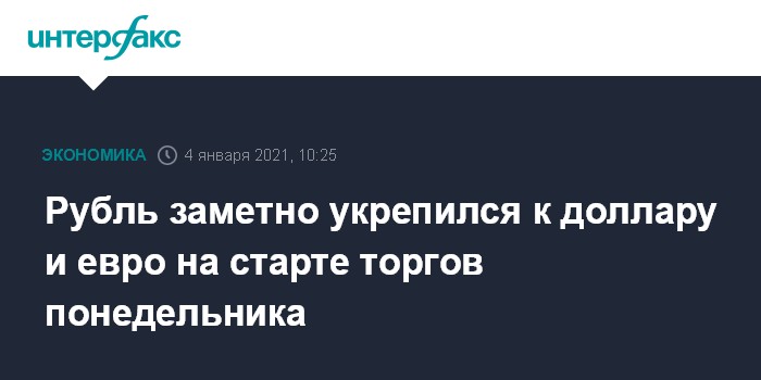 По мнению экспертов "Интерфакс-ЦЭА", рубль растет по отношению к доллару и евро на старте первых в 2021 году торгах благодаря, прежде всего, укрепляющейся нефти в ожидании решений ОПЕК+ относительно объемов добычи в феврале. Стоимость мартовских фьючерсов на нефть Brent на лондонской бирже ICE Futures к 10:01 по Москве в понедельник составила $52,98 за баррель, что на 2,28% выше цены на закрытие предыдущей сессии. По итогам торгов 31 декабря эти контракты подорожали на 0,3% - до $51,8 за баррель.