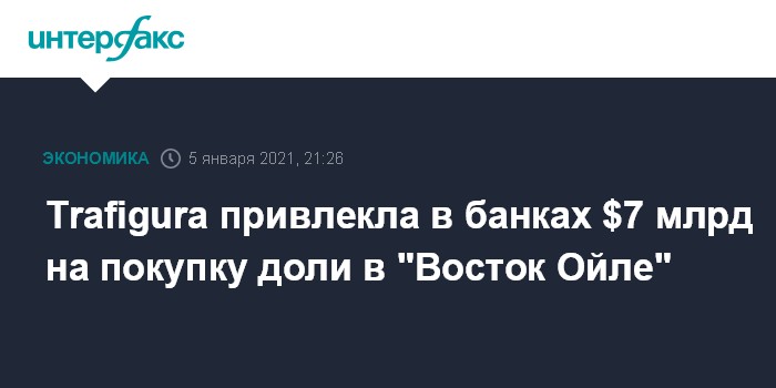 Москва. 5 января. INTERFAX.RU - Банки предоставили структуре швейцарского трейдера Trafigura 5,775 млрд евро ($7 млрд) на покупку у "Роснефти" доли в арктическом проекте "Восток Ойл".