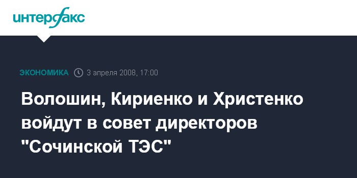 Москва. 3 апреля. INTERFAX.RU - В новый совет директоров ОАО "Сочинская ТЭС" вошли, в числе прочих, глава совета директоров РАО "ЕЭС России" Александр Волошин, председатель "Банка развития" Владимир Дмитриев, гендиректор госкорпорации "Росатом" Сергей Кириенко, замминистра экономического развития и торговли РФ Андрей Клепач и глава Минпромэнерго РФ Виктор Христенко, говорится в официальных материалах АО.