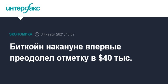 Москва. 8 января. INTERFAX.RU - Курс биткойна в ходе торгов в четверг впервые поднялся выше отметки $40000.