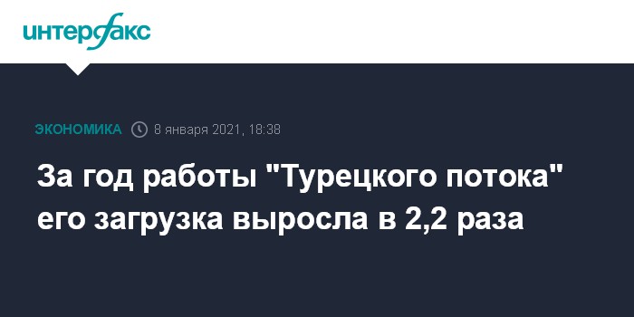 Москва. 8 января. INTERFAX.RU - За первый год работы газопровода "Турецкий поток" его загрузка выросла в 2,2 раза, в том числе для европейских потребителей - в 2,5 раза, приводит "Газпром" комментарий председателя правления концерна Алексея Миллера.
