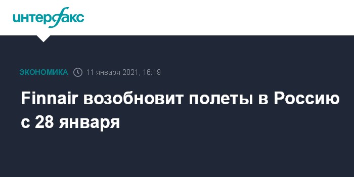 Москва. 11 января. INTERFAX.RU - Авиакомпания Finnair сообщила, что возобновит полеты в Петербург с 28 января, рейсы в Москву запланированы со 2 марта.