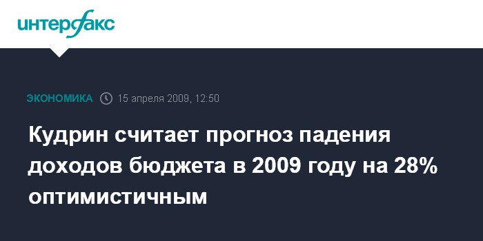 Москва. 15 апреля. INTERFAX.RU - Оценка падения доходов федерального бюджета в 2009 году на 28% оптимистична, считает вице-премьер, министр финансов РФ Алексей Кудрин. "На 2009 год доходы федерального бюджета по приблизительным, и, наверное - оптимистическим оценкам упадут на 28%", - сказал он на конференции РСПП.