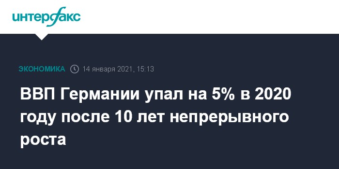 Москва. 14 января. INTERFAX.RU - Экономика Германии сократилась на 5% в 2020 году после десяти лет непрерывного роста, свидетельствуют предварительные данные Федерального статистического агентства ФРГ (Destatis).