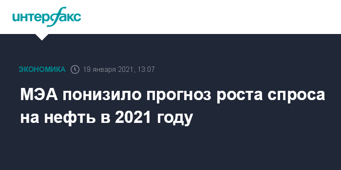 Москва. 19 января. INTERFAX.RU - Международное энергетическое агентство (МЭА) понизило прогноз роста спроса на нефть в 2021 году на 280 тысяч баррелей в сутки, до 5,5 млн б/с.