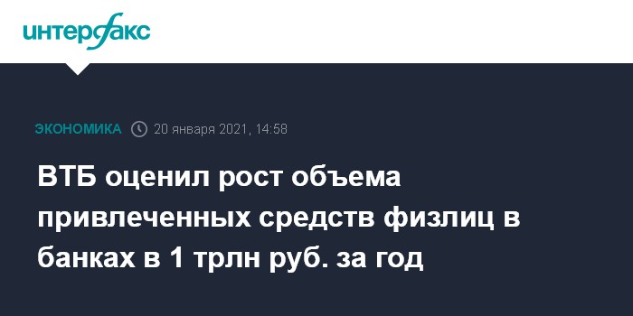 Объем срочных депозитов физических лиц в российских банках в 2020 году, по оценкам ВТБ, снизился примерно на 10% и составил 20,6-20,7 трлн рублей. Рынок накопительных и текущих счетов (за исключением счетов эскроу) вырос более чем на 40% и превысил 10,6 трлн рублей. Общий объем остатков на срочных счетах и счетах до востребования (за исключением счетов эскроу) увеличился приблизительно на 990 млрд рублей (с учетом валютной переоценки).