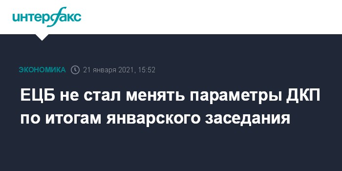 Москва. 21 января. INTERFAX.RU - Европейский центральный банк (ЕЦБ) ожидаемо сохранил базовую процентную ставку по кредитам на нулевом уровне, ставку по депозитам - на уровне минус 0,5%.