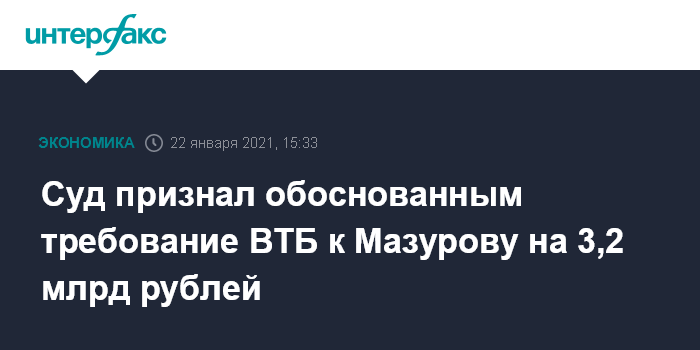 Москва. 22 января. INTERFAX.RU - Арбитражный суд Москвы признал обоснованным требование ВТБ к владельцу "Нового потока" Дмитрию Мазурову на сумму 3,2 млрд рублей. Как следует из картотеки суда, арбитраж 20 января включил в реестр кредиторов Мазурова 2,6 млрд рублей долга банку и 569,4 млн рублей неустойки.