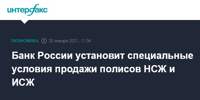Москва. 25 января. INTERFAX.RU - ЦБ РФ установит специальные условия для страховых компаний при продаже ими полисов инвестиционного и накопительного страхования жизни (ИСЖ и НСЖ). Проект соответствующего указания размещен на официальном сайте регулятора в понедельник.