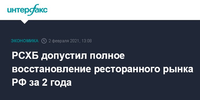 Москва. 2 февраля. INTERFAX.RU - Российский рынок общественного питания может вырасти на 17% в 2021 году, а на полное восстановление может уйти больше двух лет, прогнозирует Россельхозбанк (РСХБ).
