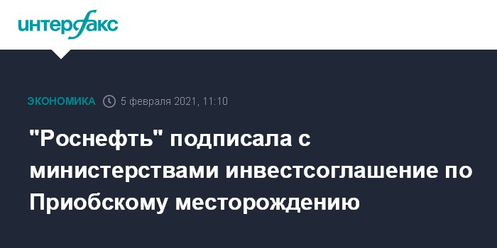Москва. 5 февраля. INTERFAX.RU - Минфин, Минприроды и НК "Роснефть" подписали инвестиционное соглашение о стимулировании добычи нефти на Приобском месторождении.