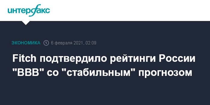 Москва. 6 февраля. INTERFAX.RU - Международное рейтинговое агентство Fitch подтвердило долгосрочные рейтинги дефолта эмитента (РДЭ) Российской Федерации в иностранной и национальной валютах на уровне "BBB".
