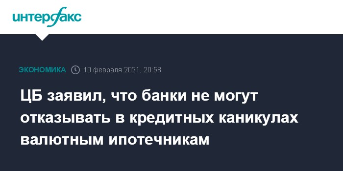 Москва. 10 февраля. INTERFAX.RU - Банки не имеют права отказывать в предоставлении кредитных каникул клиентам с валютной ипотекой, говорится в письме ЦБ РФ, опубликованном на сайте регулятора.