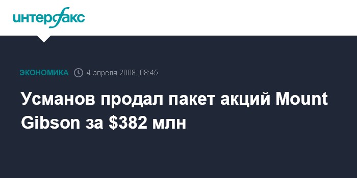 Москва. 4 апреля. INTERFAX.RU - Кипрская Gazmetall Holding Cyprus Ltd, контролируемая российским предпринимателем Алишером Усмановым, продала в четверг институциональным инвесторам за 418 млн австралийских долларов ($382 млн) пакет акций австралийской Mount Gibson Iron Limited, сообщает The Wall Street Journal.