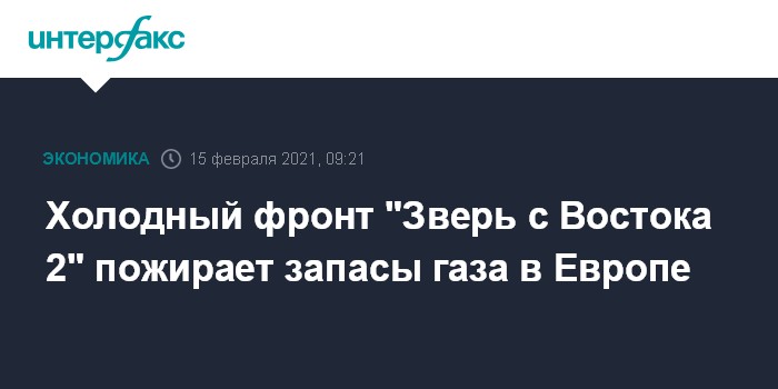 Москва. 15 февраля. INTERFAX.RU - Холодный фронт, получивший название "Зверь с Востока 2" по аналогии с легендарным похолоданием трехлетней давности, продолжает опустошать подземные хранилища газа в Европе.