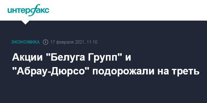 Москва. 17 февраля. INTERFAX.RU - Акции "Белуга Групп" и "Абрау-Дюрсо", двух российских алкогольных компаний с листингом, активно растут в начале торгов на Московской бирже в среду. В частности, бумаги "Белуга Групп" подорожали на 29% (до 4093 рубля за штуку), а акции "Абрау-Дюрсо" - на 34,8% (до 267,5 рубля за штуку).