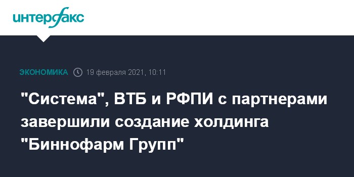 Москва. 19 февраля. INTERFAX.RU - АФК "Система", ВТБ и РФПИ с партнерами завершили создание фармацевтического холдинга "Биннофарм Групп", сообщили стороны в пятницу.