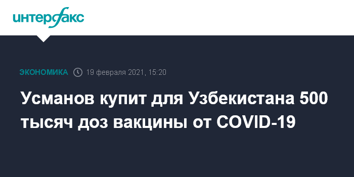 Москва. 19 февраля. INTERFAX.RU - Алишер Усманов пообещал купить для Узбекистана 500 000 доз вакцины от коронавируса, сообщил в совете депутатов Наманганской области президент страны Шавкат Мирзиеев. Он напомнил, что на первом этапе вакцинации планируется закупка 1 млн доз препарата "Спутник V".