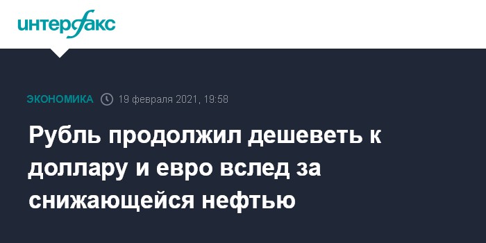 Как отмечают эксперты "Интерфакс-ЦЭА", рубль снижается к доллару и евро на вечерних торгах, отыгрывая снижение котировок нефти и в ожидании новостей относительно санкций. Участники рынка энергоносителей фиксируют прибыль перед выходными днями в условиях ослабления факторов поддержки, связанных с перебоями поставок в США из-за сильных морозов.