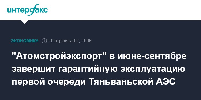 Пекин. 19 апреля. INTERFAX.RU - Российское ЗАО "Атомстройэкспорт" готовится в июне-сентябре 2009 года завершить двухлетнюю гарантийную эксплуатацию первой очереди Тяньваньской АЭС в Китае и окончательно передать ее китайскому заказчику, сообщил журналистам руководитель представительства ЗАО АСЭ в Китае "Лянь Юнь Ган" Александр Селихов в ходе Восьмой международной ядерной выставки "Nuclear-2009".