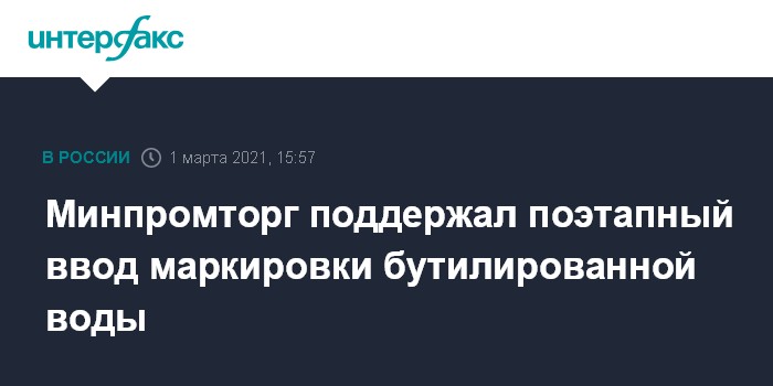 Москва. 1 марта. INTERFAX.RU - Минпромторг считает целесообразным поэтапный ввод маркировки бутилированной воды по аналогии с маркировкой молочной продукции, сообщила директор департамента системы маркировки товаров и легализации оборота министерства Екатерина Приезжева.