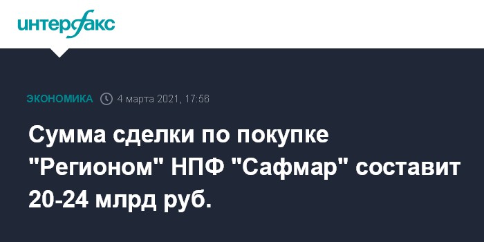 Сумма сделки по покупке "Регионом" НПФ "Сафмар" составит 20-24 млрд руб.