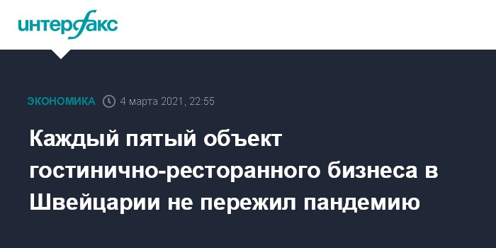 Москва. 4 марта. INTERFAX.RU - Около 20% владельцев объектов, занимающихся гостиничным или ресторанным бизнесом в Швейцарии, прекратили свою деятельность во время пандемии, сообщают в четверг швейцарские СМИ со ссылкой на исследование ассоциации GastroSuisse.