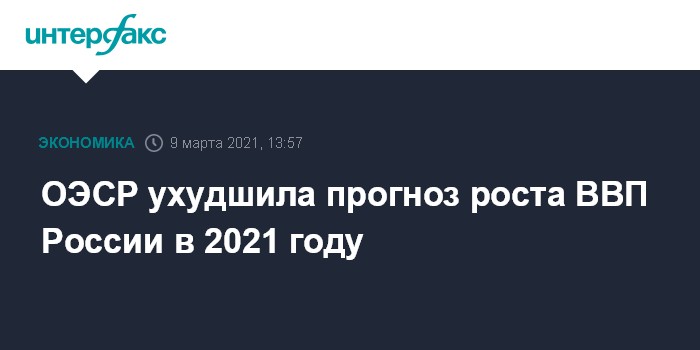 Москва. 9 марта. INTERFAX.RU - Организация экономического сотрудничества и развития (ОЭСР) ухудшила прогноз роста ВВП России на 2021 год и повысила ожидания на 2022 год.