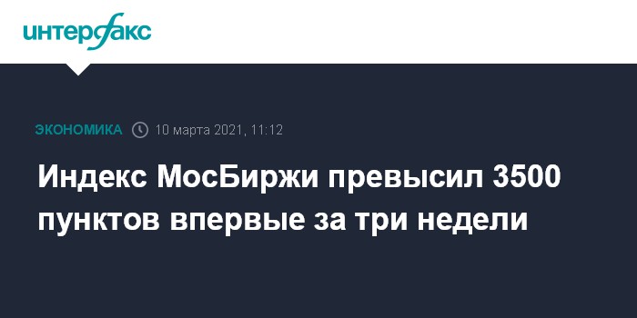 Москва. 10 марта. INTERFAX.RU - Индекс МосБиржи, один из основных российских фондовых индикаторов, утром в среду превысил рубеж 3500 пунктов впервые за три недели на фоне ослабления рубля и новой волны роста blue chips во главе с "Яндексом", несмотря на коррекционную просадку нефти.
