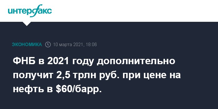 ФНБ в 2021 году дополнительно получит 2,5 трлн руб. при цене на нефть в $60/барр.