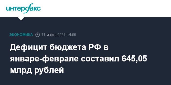 Москва. 11 марта. INTERFAX.RU - Федеральный бюджет РФ в январе-феврале 2021 года, по предварительной оценке, исполнен с дефицитом 645,05 млрд рублей, сообщил Минфин. Министерство с некоторых пор перестало приводить оценку размера дефицита по отношению к объему ВВП.