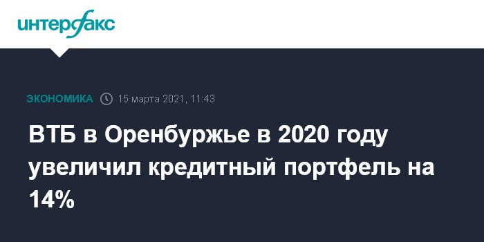 Москва. 15 марта. INTERFAX.RU - Банк ВТБ в 2020 году увеличил кредитный портфель в Оренбургской области на 14% - до 48,2 млрд рублей, портфель привлеченных средств - на треть, до 49,6 млрд рублей, сообщает пресс-служба банка в Приволжском федеральном округе.
