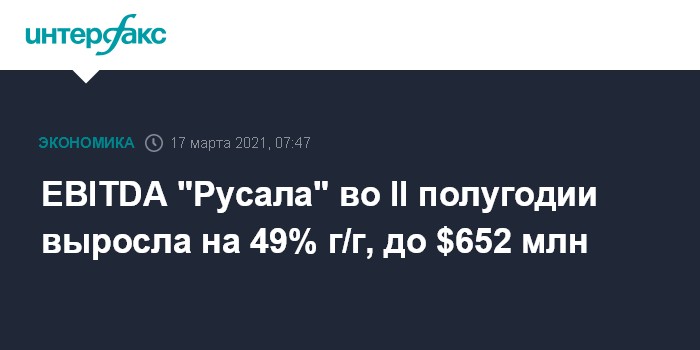 Москва. 17 марта. INTERFAX.RU - Скорректированная EBITDA "Русала" во втором полугодии 2020 г. выросла на 49% г/г, до $652 млн, сообщила компания в среду.