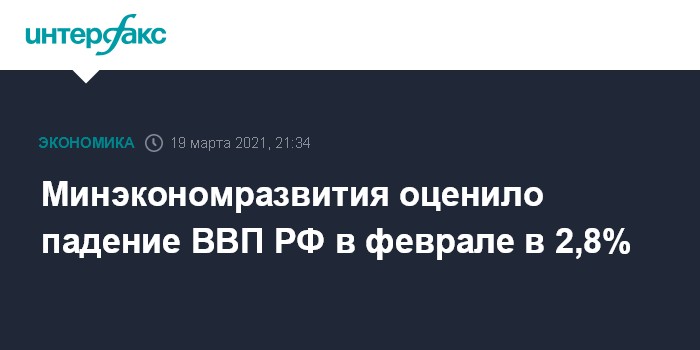 Москва. 19 марта. INTERFAX.RU - ВВП РФ в феврале 2021 года снизился на 2,8% по сравнению с февралем 2020 года после снижения на 2,2% по уточненной оценке в январе (уточнена с 2,4%). Об этом говорится в опубликованном в пятницу обзоре Минэкономразвития "Картина деловой активности".
