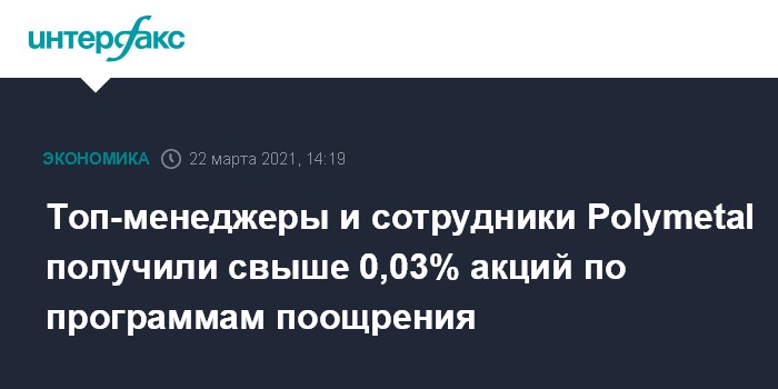 Москва. 22 марта. INTERFAX.RU - Компания Polymetal сообщила, что в соответствии с программами поощрения распределила между топ-менеджерами и сотрудниками 162 956 акций (0,0345% от увеличенного капитала). Исходя из цены этих бумаг на закрытии торгов в Лондоне в пятницу, весь пакет стоит 2,5 млн фунтов ($3,4 млн).