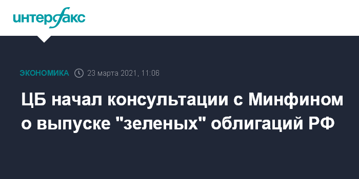 Москва. 23 марта. INTERFAX.RU - Банк России начал консультации с Минфином по поводу выпуска первых "зеленых" государственных облигаций, заявил первый зампред ЦБ РФ Сергей Швецов в ходе международного финансового форума НФА.