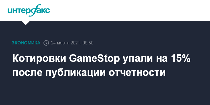 Москва. 24 марта. INTERFAX.RU - Котировки американской корпорации GameStop, владельца сети магазинов видеоигр, упали на 15,3% на дополнительных торгах после публикациим отчета за IV квартал 2020 года.