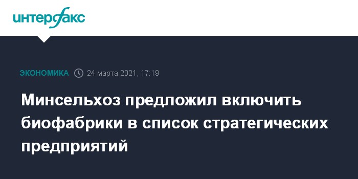 Москва. 24 марта. INTERFAX.RU - Минсельхоз РФ предлагает включить биофабрики в перечень стратегических предприятий.