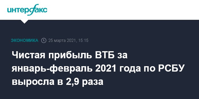 Чистая прибыль ВТБ за январь-февраль 2021 года по РСБУ выросла в 2,9 раза