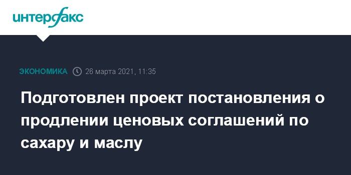 Москва. 26 марта. INTERFAX.RU - Подготовлен проект постановления правительства РФ о продлении сроков ценовых соглашений по сахару и подсолнечному маслу, сообщается на сайте подготовки официальных правовых актов.