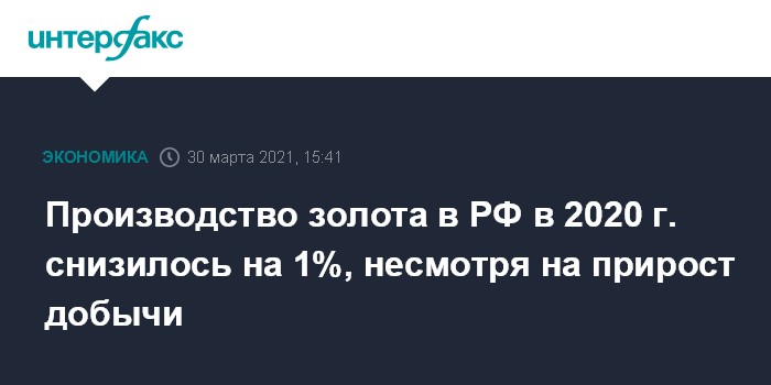 Производство золота в РФ в 2020 г. снизилось на 1%, несмотря на прирост добычи