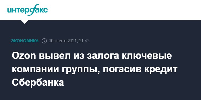 Москва. 30 марта. INTERFAX.RU - Ozon освободил из залога свою основную операционную компанию и ее холдинговую структуру после погашения кредита в 6 млрд рублей, привлеченного в Сбербанке.