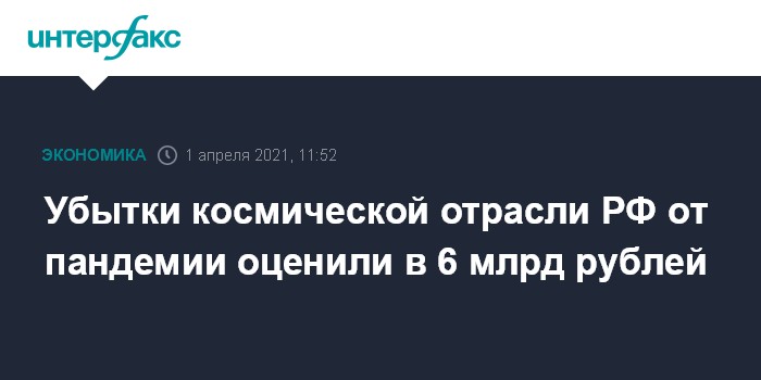 Москва. 1 апреля. INTERFAX.RU - Чистый убыток "Роскосмоса" и предприятий космической отрасли России из-за пандемии составил около 6 млрд рублей, сообщил первый замгендиректора "Роскосмоса" по финансам Максим Овчинников.