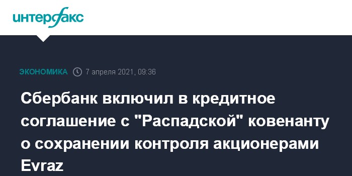 Сбербанк включил в кредитное соглашение с "Распадской" ковенанту о сохранении контроля акционерами Evraz