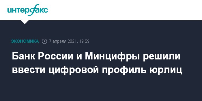 Москва. 7 апреля. INTERFAX.RU - Банк России и Минцифры планируют создать цифровой профиль юридического лица, заявил на съезде Ассоциации российских банков начальник управления анализа и регулирования департамента финансовых технологий ЦБ Дмитрий Дубинин.