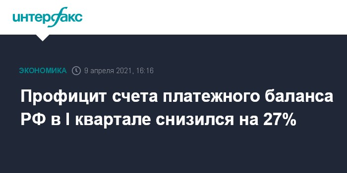 Москва. 9 апреля. INTERFAX.RU - Положительное сальдо счета текущих операций платежного баланса РФ в первом квартале 2021 года составило $16,8 млрд, что на 27% меньше, чем за аналогичный период 2020 года ($23 млрд). Такая информация содержится в оценке платежного баланса РФ, опубликованной на сайте Банка России.
